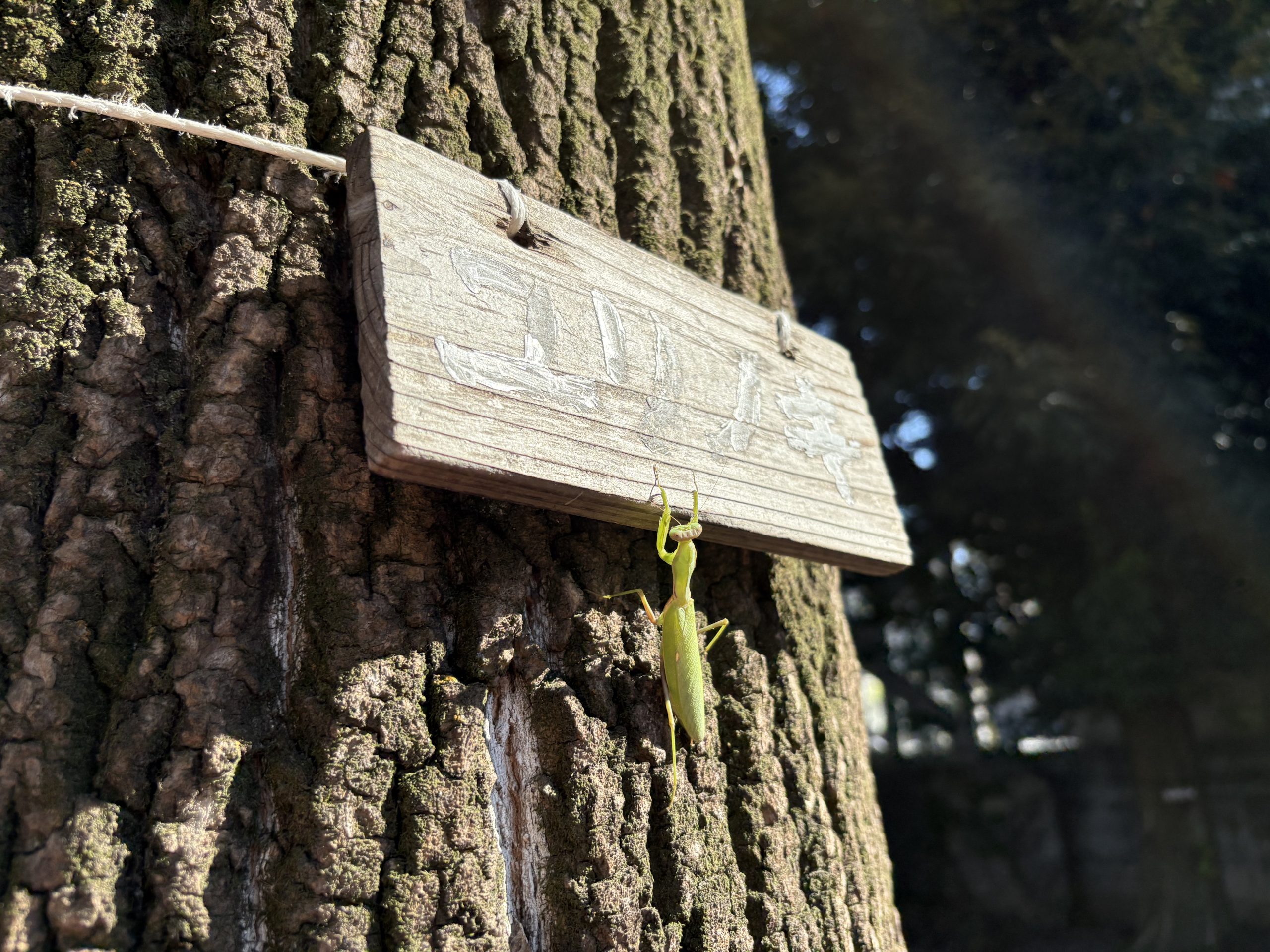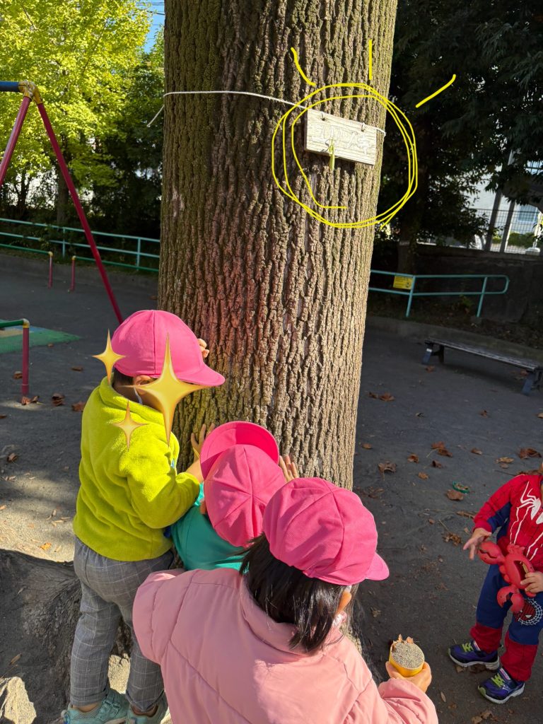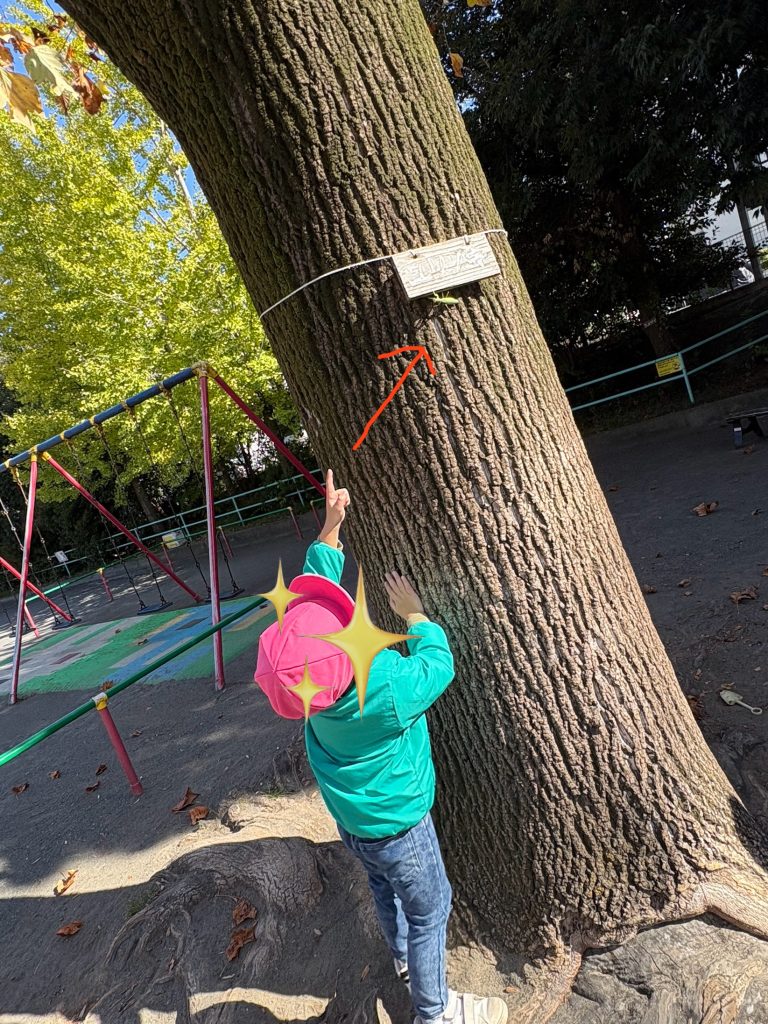 公園でおままごとや滑り台、アスレチックを楽しんでいると大きな木に緑色の何かを先生が発見!